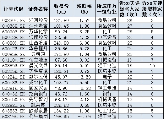 與此同時,出色的表現(xiàn)也受到機構的高度關注。統(tǒng)計顯示,在上述66只強勢股中,機構近30日內給予“買入”或“增持”以上評級的公司達61家,占比逾九成,其中,推薦次數(shù)超過10次的公司達41家。