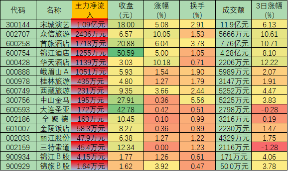 表:周二大單凈流入旅游酒店股市場表現一覽