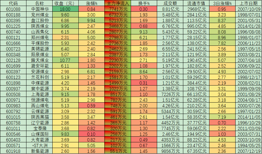 表:周三呈大單凈流入煤炭采選股市場(chǎng)表現(xiàn)一覽