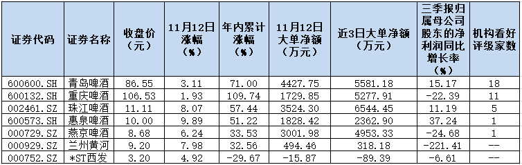 可以看到,A股在大漲后出現(xiàn)短期正常休整,同時(shí)主力資金進(jìn)入結(jié)構(gòu)性調(diào)倉階段,市場分化現(xiàn)象較為明顯,板塊間的輪動(dòng)以及風(fēng)格的切換較為頻繁。在這期間啤酒股吸金能力不容小覷?!蹲C券日報(bào)》記者根據(jù)同花順數(shù)據(jù)統(tǒng)計(jì)發(fā)現(xiàn),近3個(gè)交易日,6只啤酒股呈現(xiàn)大單資金凈流入態(tài)勢,占行業(yè)內(nèi)成份股家數(shù)比例為85.71%,重慶啤酒、青島啤酒、珠江啤酒等個(gè)股期間累計(jì)漲幅均在5000萬元以上。僅從11月12日來看,青島啤酒、珠江啤酒、燕京啤酒等3只個(gè)股大單資金凈流入均超3000萬元,合計(jì)吸金1.1億元。