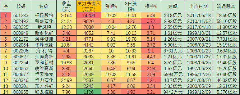 表:周一大單凈流入超1000萬元化纖股市場表現(xiàn)一覽
