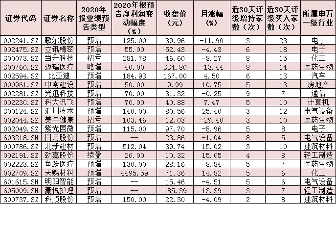 在走勢(shì)分化中,部分業(yè)績(jī)出色的公司受到機(jī)構(gòu)的高度關(guān)注。統(tǒng)計(jì)顯示,在上述年報(bào)預(yù)喜股中,機(jī)構(gòu)近30日內(nèi)給予“買入”或“增持”以上評(píng)級(jí)的公司達(dá)97家,其中,包括歌爾股份、立訊精密、當(dāng)升科技、邁瑞醫(yī)療、比亞迪、中南建設(shè)、光迅科技、匯川技術(shù)、科大訊飛等19家公司,被推薦次數(shù)均超過10次及以上,值得關(guān)注。