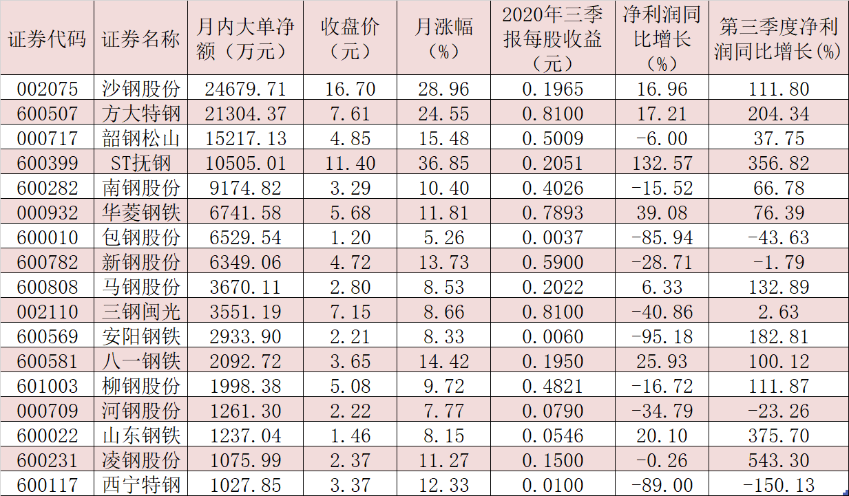 表:11月份以來獲超1000萬元大單資金搶籌的鋼鐵股一覽