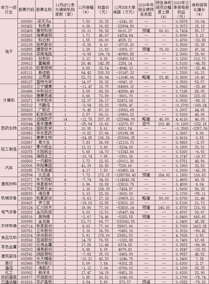 良好的業(yè)績穩(wěn)定增長或是本月QFII頻繁調(diào)研的重要動力。在上述11月份被QFII調(diào)研的57家公司中,2020年前三季度實現(xiàn)凈利潤同比增長的公司共有39家,占比68.42%。