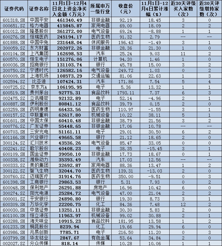 表:11月份以來(lái)截至12月4日北上資金凈買(mǎi)入的41只個(gè)股情況: