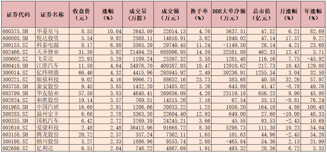 在大單資金凈流入的助推之下,今天的新能源汽車板塊個股表現(xiàn)不錯,有54只個股逆市上漲,華菱星馬和悅達投資更是強勢漲停,科泰電源、天齊鋰業(yè)、飛榮達、江淮汽車等個股漲幅居前。