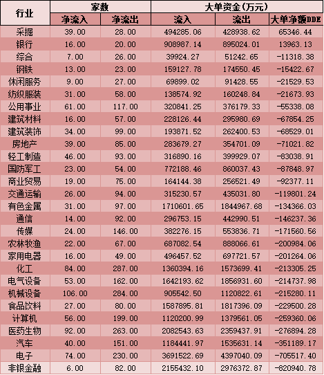 二、周三(12月9日)申萬一級(jí)行業(yè)大單資金流向