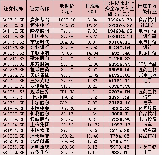 表:12月份以來北上資金凈買入的25只個(gè)股情況: