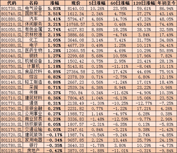 從盤面來看,在申萬一級28個行業(yè)中,周一,電氣設(shè)備行業(yè)指數(shù)以5.83%的漲幅位居首位,緊隨其后的是,國防軍工、汽車和休閑服務(wù)等三行業(yè),漲幅均逾3%,分別為3.51%、3.41%和3.21%。