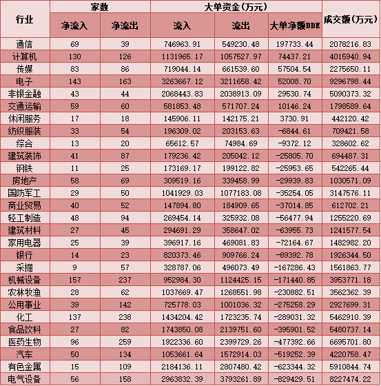 二、周二(12月29日)申萬(wàn)一級(jí)行業(yè)大單資金流向