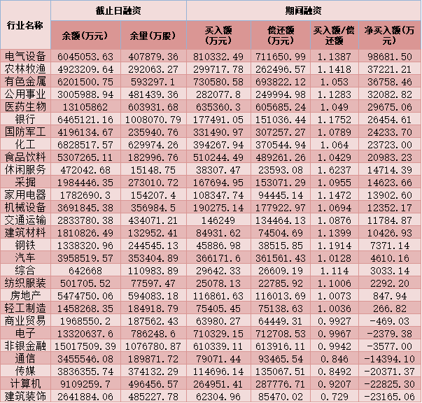 六、截至12月28日申萬(wàn)一級(jí)行業(yè)兩融交易情況