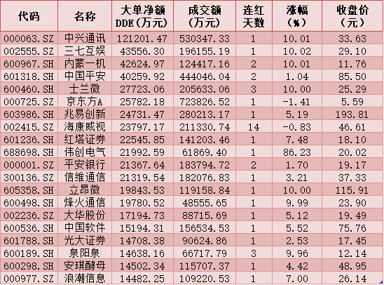 一、周二(12月29日)DDE大單資金凈買(mǎi)入TOP20