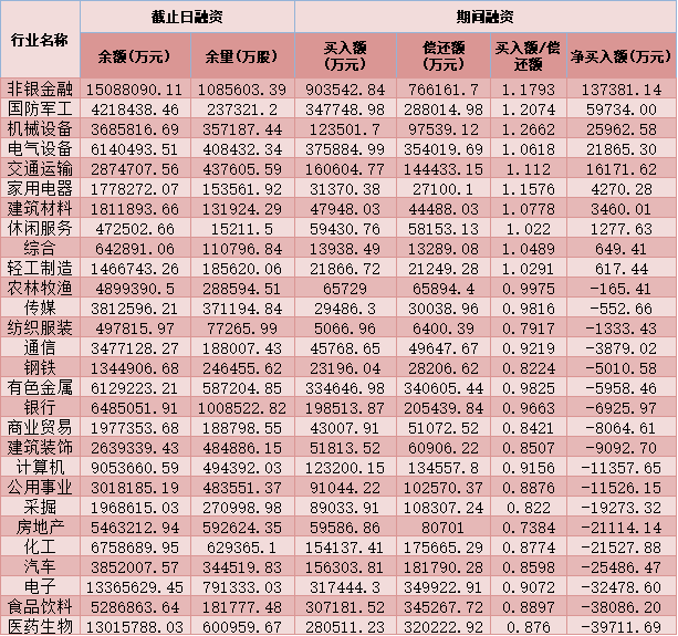 六、截至12月30日申萬一級行業(yè)兩融交易情況