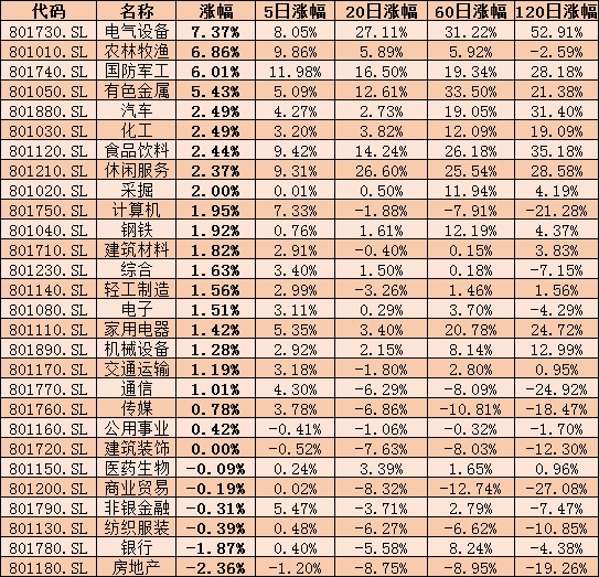 從行業(yè)來看,申萬一級28個行業(yè)多數(shù)飄紅。其中,電氣設備板塊表現(xiàn)強勢,漲幅達7.37%;緊隨其后的是農林牧漁、國防軍工和有色金屬等三行業(yè),漲幅均超5%,分別為6.86%、6.01%和5.43%;房地產、銀行等兩行業(yè)跌幅居前均超1%。