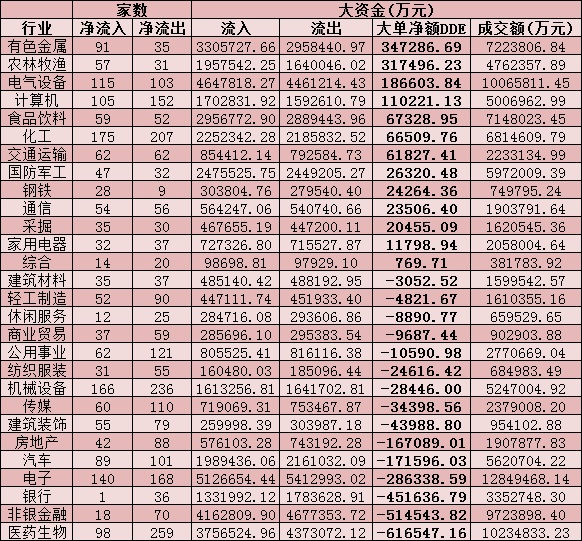 從資金層面看,今日A股大單資金整體凈流出111.15億元,其中,有1728只個股凈流入,2302只個股凈流出。從申萬一級的28個行業(yè)來看,有13個行業(yè)呈現(xiàn)大單資金凈流入態(tài)勢,其中,有色金屬和農(nóng)林牧漁等兩行業(yè)資金凈流入均超30億元,分別為34.7億元和31.75億元,合計66.45億元。緊隨其后的是電氣設(shè)備、計算機等兩行業(yè),資金凈流入均超10億元。另外,醫(yī)藥生物、非銀金融、銀行、電子等行業(yè)資金凈流出均超20億元。