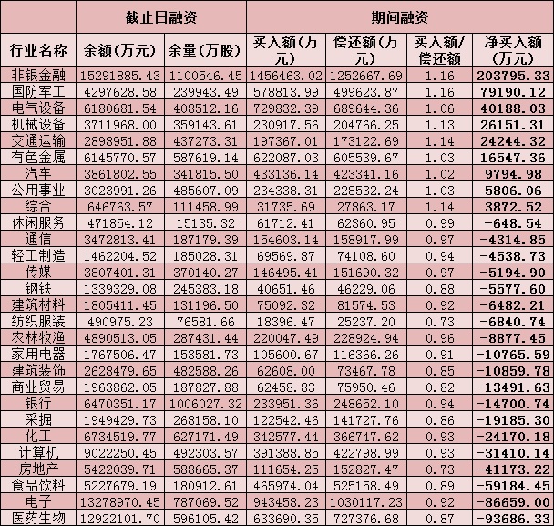 六、截至12月31日申萬級一級行業(yè)兩融交易情況