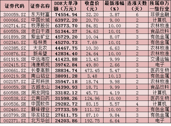 一、周一(1月4日)DDE大單資金凈買入TOP20