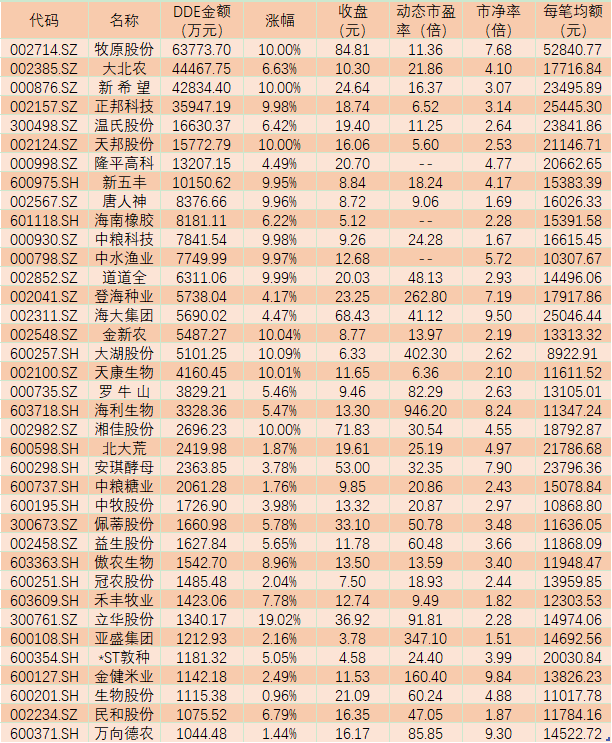 節(jié)日效應對大單資金也產(chǎn)生了較強吸引,據(jù)《證券日報》記者通過IFIND統(tǒng)計顯示,周一農(nóng)林牧漁股合計大單凈買入資金達31.90億元,57只個股呈流入態(tài)勢,占比59.77%,其中,牧原股份(6.38億元)、大北農(nóng)(4.45億元)、新希望(4.28億元)、正邦科技(3.59億元)、溫氏股份(1.66億元)、天邦股份(1.58億元)、隆平高科(1.32億元)、新五豐(1.02億元)等8只個股大單買入額均超1億元,合計24.28億元。