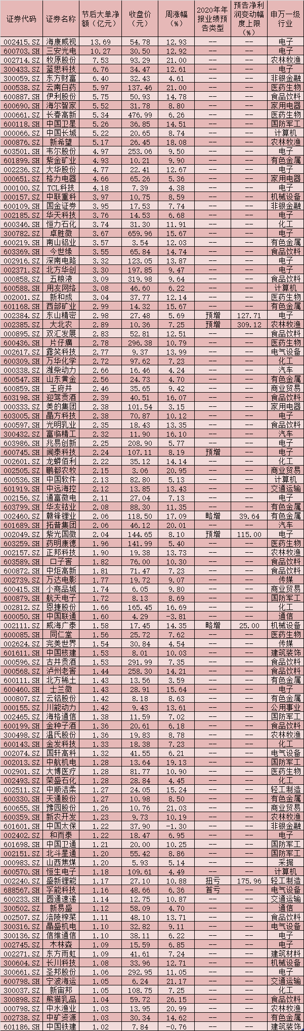 表:節(jié)后的2個交易日實現(xiàn)大單資金凈流入超1億元的個股