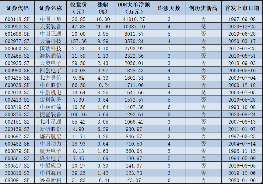 可以看到,國防軍工行業(yè)的強勢在2021年開局就表現(xiàn)得淋漓盡致。一方面,截至1月5日收盤,近半數(shù)成份股實現(xiàn)連續(xù)上漲,中兵紅箭、上海瀚訊、北方導(dǎo)航、中國衛(wèi)通、航天電子、烽火電子、雷科防務(wù)、景嘉微等個股連漲天數(shù)達到5天及以上。另一方面,包括中航沈飛、鋼研高納、航天彩虹、中航光電等在內(nèi)的7只國防軍工股紛紛于1月5日創(chuàng)出歷史新高。