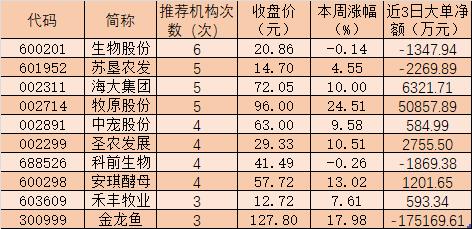 進(jìn)一步梳理發(fā)現(xiàn),農(nóng)林牧漁行業(yè)獲得推薦次數(shù)最多的前十大“金股”分別為生物股份、蘇墾農(nóng)發(fā)、海大集團、牧原股份、中寵股份、圣農(nóng)發(fā)展、科前生物、安琪酵母、禾豐牧業(yè)和金龍魚。