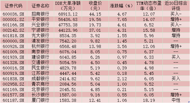 表:周三銀行板塊大單資金凈買入超1000萬(wàn)元個(gè)股一覽