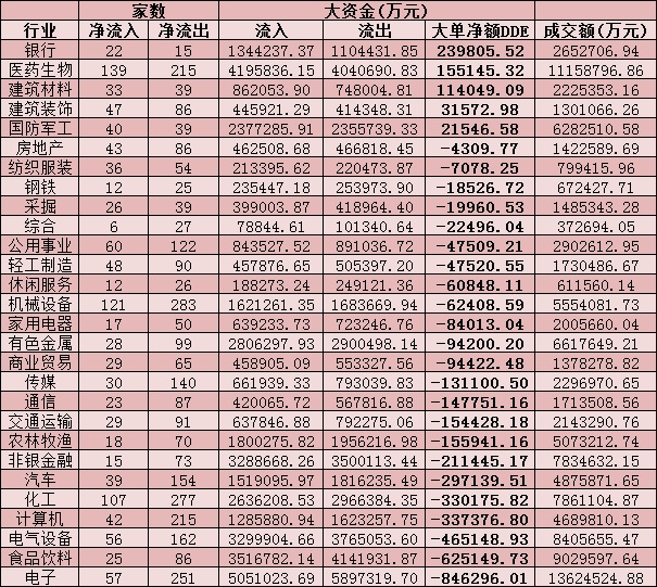 從資金層面看,今日A股大單資金整體凈流出373.9億元,其中,有1125只個(gè)股呈現(xiàn)資金凈流入,2910只個(gè)股呈現(xiàn)資金凈流出。從申萬(wàn)一級(jí)的28個(gè)行業(yè)來(lái)看,有5個(gè)行業(yè)呈現(xiàn)大單資金凈流入態(tài)勢(shì),其中,銀行、醫(yī)藥生物、建筑材料等三行業(yè)資金凈流入均超10億元,分別為23.98億元、15.51億元和11.4億元,緊隨其后的是建筑裝飾、國(guó)防軍工等兩行業(yè)。另外電子、食品飲料、電氣設(shè)備等行業(yè)資金凈流出均超40億元。
