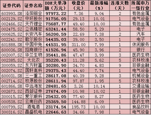 一、周四(1月7日)DDE大單資金凈買入TOP20