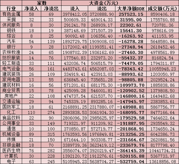 從資金層面看,今日A股大單資金整體凈流出366.7億元,其中,有891只個(gè)股呈現(xiàn)資金凈流入,3155只個(gè)股呈現(xiàn)資金凈流出。從申萬(wàn)一級(jí)的28個(gè)行業(yè)來(lái)看,有4個(gè)行業(yè)呈現(xiàn)大單資金凈流入態(tài)勢(shì),其中,有色金屬行業(yè)資金凈流入居首,達(dá)25.75億元,緊隨其后的是采掘、休閑服務(wù)、鋼鐵等三行業(yè),資金呈現(xiàn)出凈流入態(tài)勢(shì),分別為3.16億元、2.23億元和1.56億元。另外,電子、計(jì)算機(jī)、醫(yī)藥生物等行業(yè)資金凈流出均超30億元。