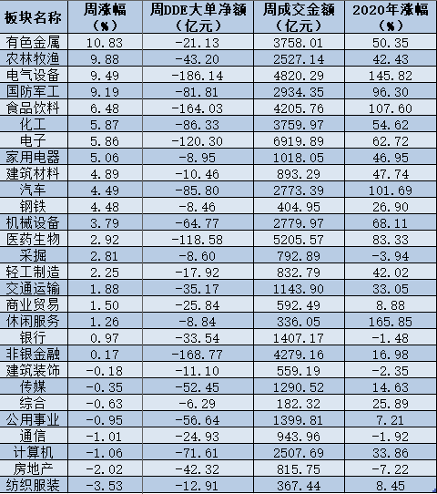 以申萬一級行業(yè)指數(shù)2021年首周漲幅排名來看,共有20個申萬一級行業(yè)指數(shù)實現(xiàn)不同程度的上漲,其中,期間累計漲幅前三名的行業(yè)分別為,有色金屬、農(nóng)林牧漁、電氣設備,這三大行業(yè)期間累計漲幅均在9%以上。而紡織服裝則成為新年首周跌幅最大的行業(yè),期間累計跌幅達到3.53%,此外,房地產(chǎn)、計算機和通信等行業(yè)期間累計跌幅也均在1%以上。