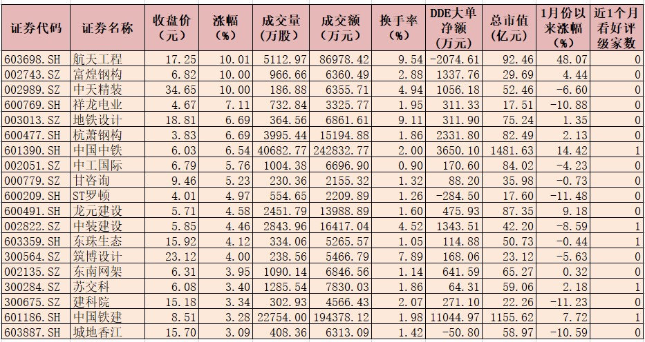 表:1月14日漲幅超3%建筑裝飾行業(yè)個股一覽