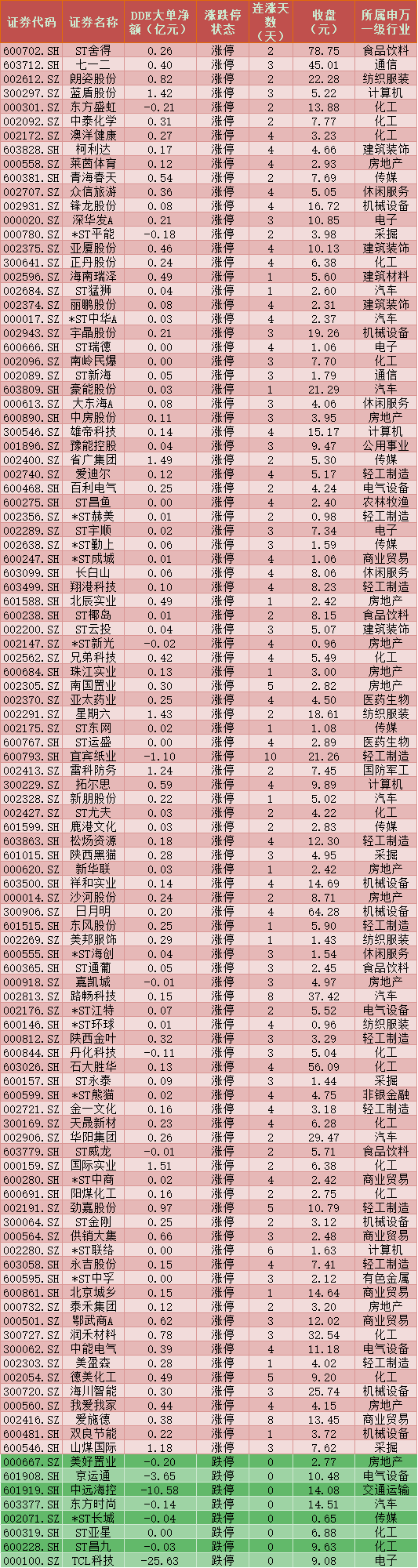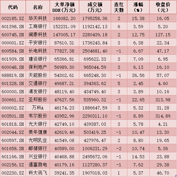 一、周二(1月19日)DDE大單資金凈買入TOP20