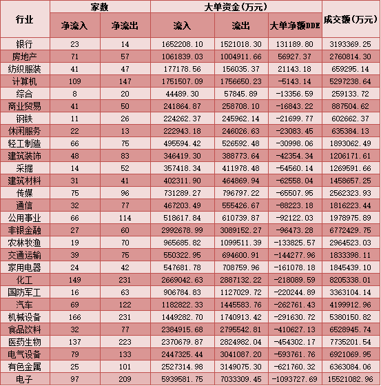 二、周二(1月19日)申萬一級行業(yè)大單資金流向