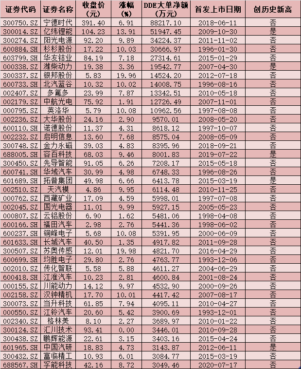 表:1月20日大單資金凈流入超3000萬(wàn)元的新能源汽車(chē)概念股