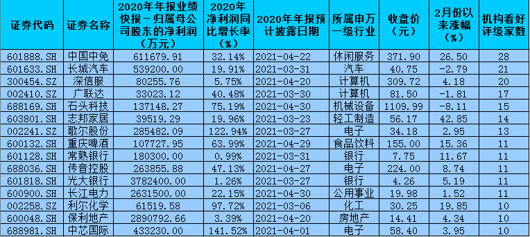 的確,自A股進(jìn)入年報披露期之后,核心資產(chǎn)業(yè)績表現(xiàn)對股價的傳導(dǎo)在市場中變得極為敏感,機(jī)構(gòu)的選股壓力明顯增大。在這一背景下,上述171家2020年凈利潤實現(xiàn)同比增長的公司中,仍有86家公司最近1個月內(nèi)被機(jī)構(gòu)給予“買入”或“增持”等看好評級,其中,15家公司機(jī)構(gòu)看好評級家數(shù)在10家以上,中國中免、長城汽車、深信服等3只個股機(jī)構(gòu)看好評級家數(shù)均在20家及以上,分別為28家、21家、20家。