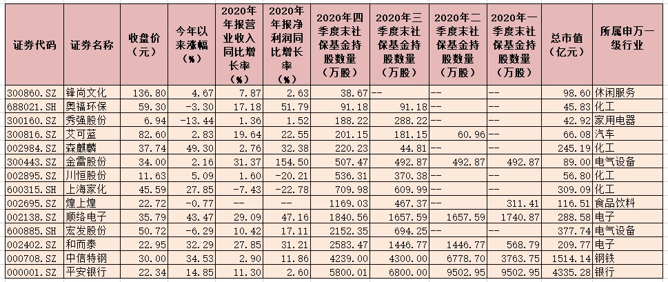 表:社保基金2020年四季度末持倉14只個(gè)股一覽
