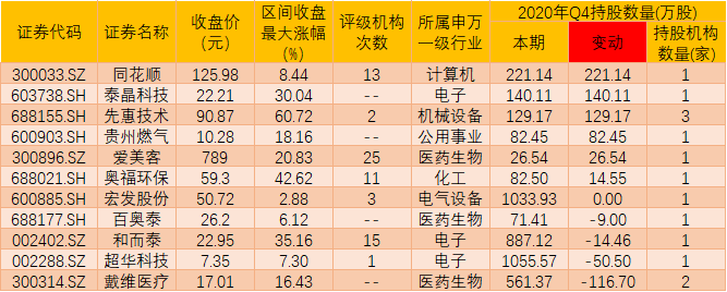 具體來(lái)看,新進(jìn)增持方面,截至2020年四季度末,QFII新進(jìn)同花順、泰晶科技、先惠技術(shù)、貴州燃?xì)?、?ài)美客等5只個(gè)股,并對(duì)奧福環(huán)保進(jìn)行繼續(xù)加倉(cāng)操作,QFII增持?jǐn)?shù)量為14.55萬(wàn)股,最新持股數(shù)量為82.50萬(wàn)股。此外,還持有宏發(fā)股份1033.93萬(wàn)股未動(dòng),對(duì)百奧泰、和而泰、超華科技和戴維醫(yī)療則有所減倉(cāng)。