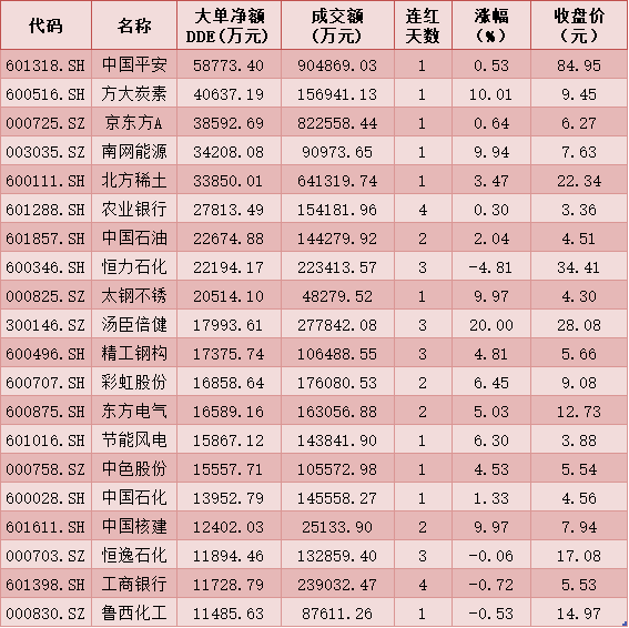 一、周一(3月8日)DDE大單資金凈買入TOP20