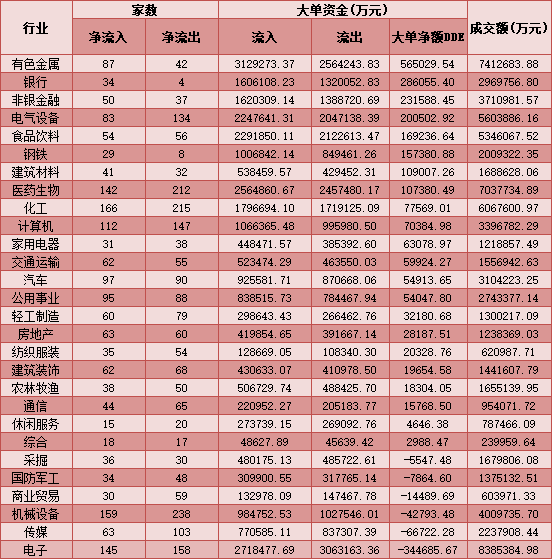 二、周四(3月11日)申萬一級行業(yè)大單資金流向