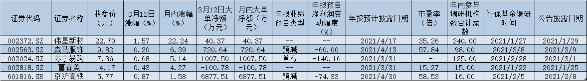 3月份以來(lái),截至3月12日,上證指數(shù)期間累計(jì)跌幅達(dá)到1.60%,深證成指期間累計(jì)跌幅為4.21%。上述5家被社?;鹫{(diào)研公司股價(jià)均出現(xiàn)逆市上漲,其中,偉星新材以期間累計(jì)漲幅22.24%位居首位,森馬服飾、蘇寧易購(gòu)、富森美、京滬高鐵等4只個(gè)股期間累計(jì)漲幅則分別為6.39%、5.14%、4.27%、1.58%。