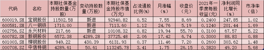 值得一提的是,作為長線資金的社保基金也提前布局部分鋼鐵股。統(tǒng)計顯示,截至今年一季度末,有6只鋼鐵股獲社?;鸪謧},合計持股市值為26.73億元。具體來看,上述6只鋼鐵股在今年一季度成為社保基金新進增持的重點目標,社保基金新進持有寶鋼股份、八一鋼鐵、永興材料等3只個股,持股數(shù)量分別為11502.58萬股、1710.00萬股、217.66萬股,社保基金繼續(xù)對新鋼股份、柳鋼股份和中信特鋼等3只個股進行加倉操作,后市表現(xiàn)值得關(guān)注。