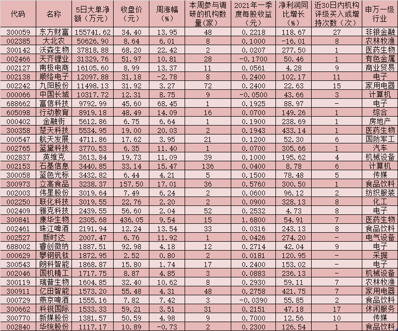 在上述本周被機構調(diào)研的174家公司中,157家公司2021年一季度實現(xiàn)凈利潤同比增長,占比逾九成。其中,有84家公司報告期內(nèi)實現(xiàn)凈利潤同比翻番,華鵬飛、盛和資源、中泰化學、萬潤科技、雅化集團、三泰控股、美錦能源等7家公司報告期內(nèi)實現(xiàn)凈利潤同比增長10倍以上。