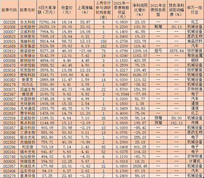 表:上周受到大單資金追捧的機(jī)構(gòu)調(diào)研股一覽