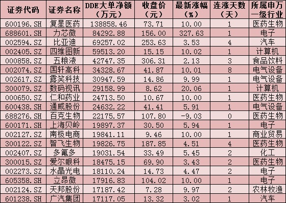 一、周一(6月28日)DDE大單資金凈買入TOP20