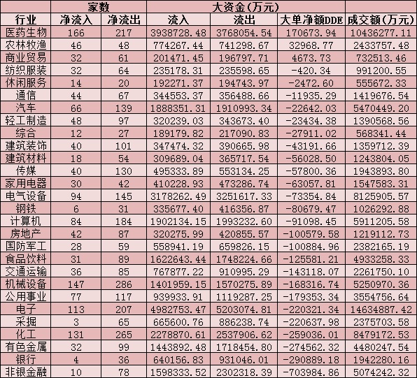 從資金層面看,周一,A股大單資金整體凈流出313.3億元,其中,有1416只個股呈現(xiàn)資金凈流入,有2886只個股呈現(xiàn)資金凈流出。從申萬一級的28個行業(yè)來看,醫(yī)藥生物、農(nóng)林牧漁、商業(yè)貿(mào)易等3個行業(yè)呈現(xiàn)資金凈流入態(tài)勢,分別為17.07億元、3.29億元和0.47億元。另外,25個行業(yè)均呈現(xiàn)資金凈流出態(tài)勢,其中,非銀金融、銀行、有色金屬、化工、采掘、電子等行業(yè),資金凈流出均超20億元。