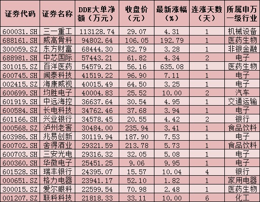 一、周三(6月30日))DDE大單資金凈買入TOP20