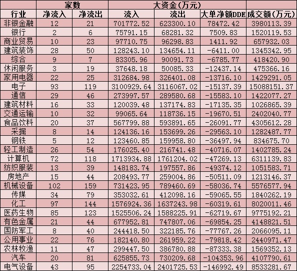 二、周三(6月30日)申萬(wàn)一級(jí)行業(yè)大單資金流向