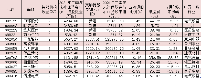 綜合來看,上述個股中,有13只個股今年二季度受到了社保基金以及QFII集體增持,增持資金達到64.65億元。具體來看,今年二季度社保基金與QFI聯(lián)手新進持有中環(huán)股份、皖維高新、魚躍醫(yī)療、前沿生物等4只個股,持股數(shù)量分別為4234.68萬股、2482.65萬股、1934.34萬股、538.42萬股;有9只個股今年二季度受上述兩類機構繼續(xù)加倉,三花智控、高能環(huán)境、東方財富、偉星新材等4只個股二季度社?;鹋cQFII增持數(shù)量也均在1000萬股以上。