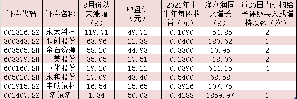 8月份以來(lái),制冷劑板塊表現(xiàn)強(qiáng)勢(shì),其整體上漲9.21%,跑贏上證指數(shù)(期間累計(jì)漲幅為6.61%),位居同花順板塊漲幅榜前列。具體到個(gè)股方面,永太科技期間股價(jià)實(shí)現(xiàn)翻番,達(dá)到119.71%,聯(lián)創(chuàng)股份、金石資源緊隨其后,期間累計(jì)漲幅分別為63.96%、58.20%,三美股份、巨化股份、永和股份、中欣氟材等4只概念股期間累計(jì)漲幅也均逾10%。
