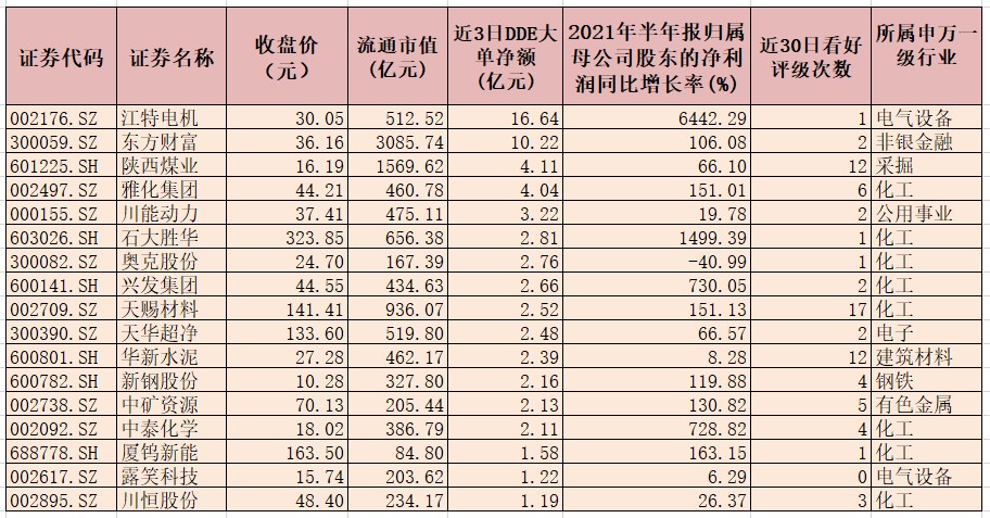 表:近3日大單資金凈流入額超1億元的創(chuàng)歷史新高股一覽